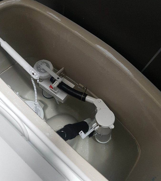 물통 뚜껑을 열어보시면 위와 같을 겁니다.(오래된 변기는 달라요.) 좌측 상단에 빨간색 뭔가가 붙어있는 장치가 보이시죠? 바로 저게 물통 속의 물 수위를 조절할 수 있는 장치입니다.