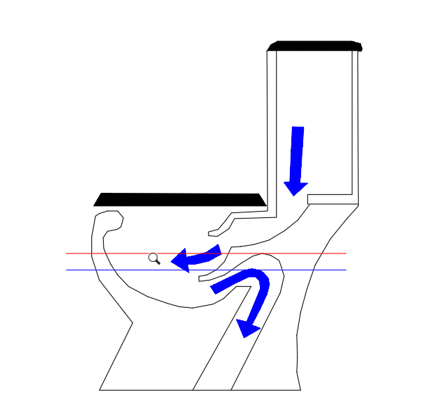 위의 그림에서 변기는 항상 파란선의 높이까지 물이 차있습니다. 그런데 우리가 레버를 내리면 변기 뒤의 물통에서 물이 내려와 빨간선 위 까지 물이 찹니다. 그러면 사이펀의 원리 때문에 물이 내려가게 되죠. 암튼 빨간선 위까지만 물이 차면 된다는 말이죠. 이제 변기 수압이 약한 경우를 살펴보시죠.