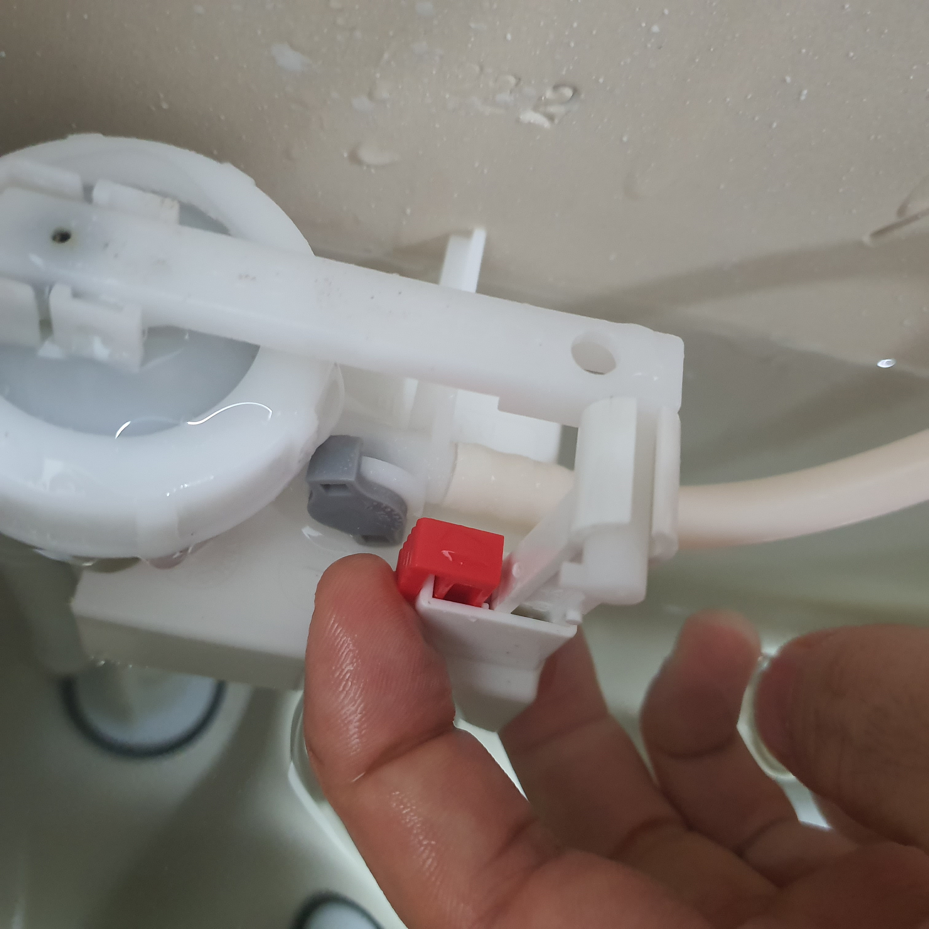 저 빨간 버튼을 위로 올려줍니다. 공간도 좁고 뻑뻑해서 잘 잘 안올라갈 수도 있는데 쎄게 올리면 올라갑니다. 그 상태에서 바로 밑의 하얀 박스가 위로 올라가도록 주욱 당겨줍니다. 무슨 말인지 잘 모르시겠으면 제가 동영상을 하나 올려드릴테니 한번 보시면 바로 이해가 가능할 거예요. 동영상 속에서는 제가 하얀 박스를 주욱 내렸다가 다시 올리는데, 박스를 내리면 수위가 낮아지고, 올리면 수위가 올라갑니다. 수위가 올라간다는 것은 물통 속의 물이 많아진다는 것이죠. 변기에서 내려오는 물이 너무 적게 느껴지시는 분들은 하얀 박스를 위로 올리셔서 사용 하시면 됩니다. 박스를 다 올리면 다시 빨간 버튼을 눌러서 고정 시켜주세요.
